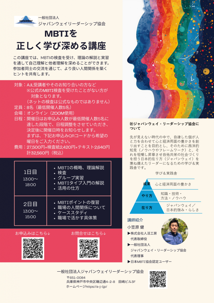 ※MBTI講座を先に受講された場合、コーチ養成<入門>講座は割引料金が適用されます。